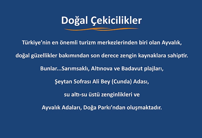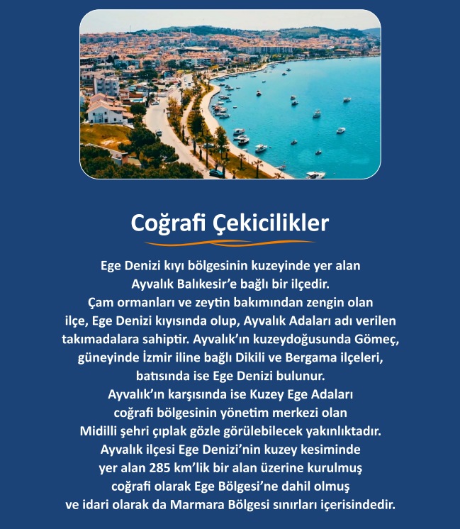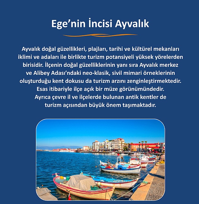 Ayvalık doğal güzellikleri, plajları, tarihi ve kültürel mekanları iklimi ve adaları ile birlikte turizm potansiyeli yüksek yörelerden birisidir. İlçenin doğal güzelliklerinin yanı sıra Ayvalık merkez ve Alibey Adası'ndaki neo-klasik, sivil mimari örneklerinin oluşturduğu kent dokusu da turizm arzını zenginleştirmektedir. Esas itibariyle ilçe açık bir müze görümündedir. Ayrıca çevre il ve ilçelerde bulunan antik kentler de turizm açısından büyük önem taşımaktadır.